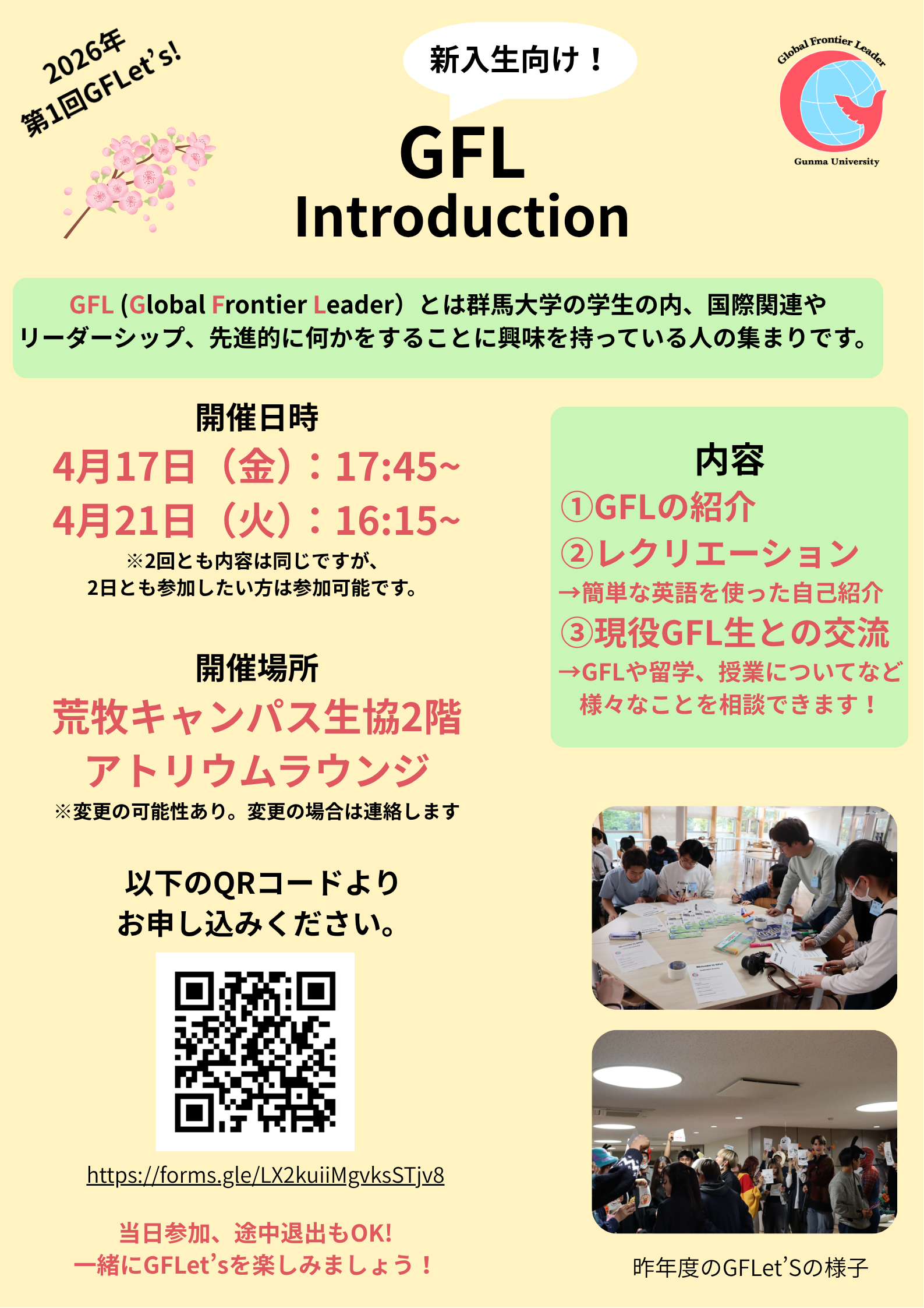 2026年度新入生向け、GFL紹介を兼ねた交流会「GFLet’s Introduction」を行います。